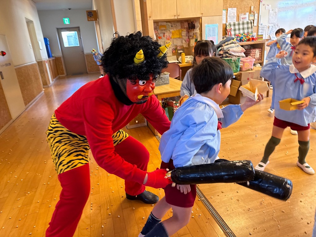 2月3日、幼稚園で節分の集会と豆まきを行いました👹 遊...