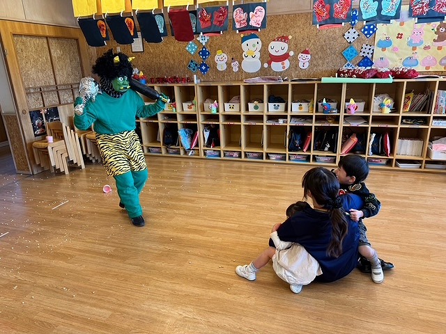 勇気を出して豆を投げる子、友だちと力を合わせて鬼に立ち向かう子、怖くて先生のそばに集まる子など、さまざまな姿が見られました。