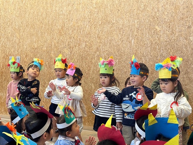 遊戯室での集会では、節分クイズに挑戦したり、子どもたちが一生懸命作った色とりどりの鬼のお面を見せ合ったりしながら、節分への気持ちを高めていきました。元気いっぱいに手を挙げながら答える姿からは、「知りたい」「やってみたい」という気持ちが伝わってきました。