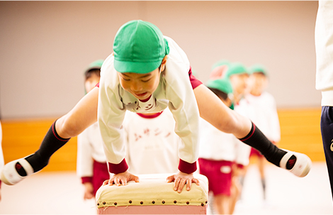 現代の子どもたちは発育は良好ですが、体力の面での低下が見られるという課題があります。当園では、専任講師のもと、様々な運動用具を使った活動で、子どもたちの基礎体力とバランス感覚を育成しています。
