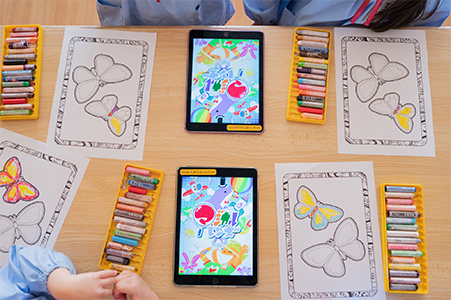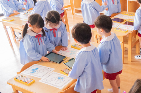 子どもたちの描いた絵がiPadで撮影すると画面の中で動き出したり、おともだちの絵が自分のタブレットへ遊びにくるなど、ICTならではの機能を活用しながら、お友達と話し合ったり協力したり、子どもたちの創造性や主体性を伸ばしていきます。