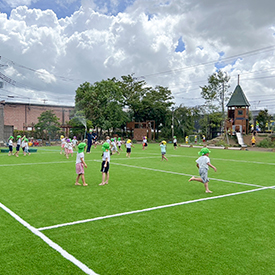 園庭の中心には人工芝を敷き、裸足で走ったり、寝転んだり、思いきり体を動かせる心地よい場所になりました。