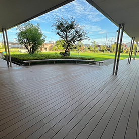 吉川ムサシノ幼稚園のエントランス正面に広がる、子どもたちの遊...
